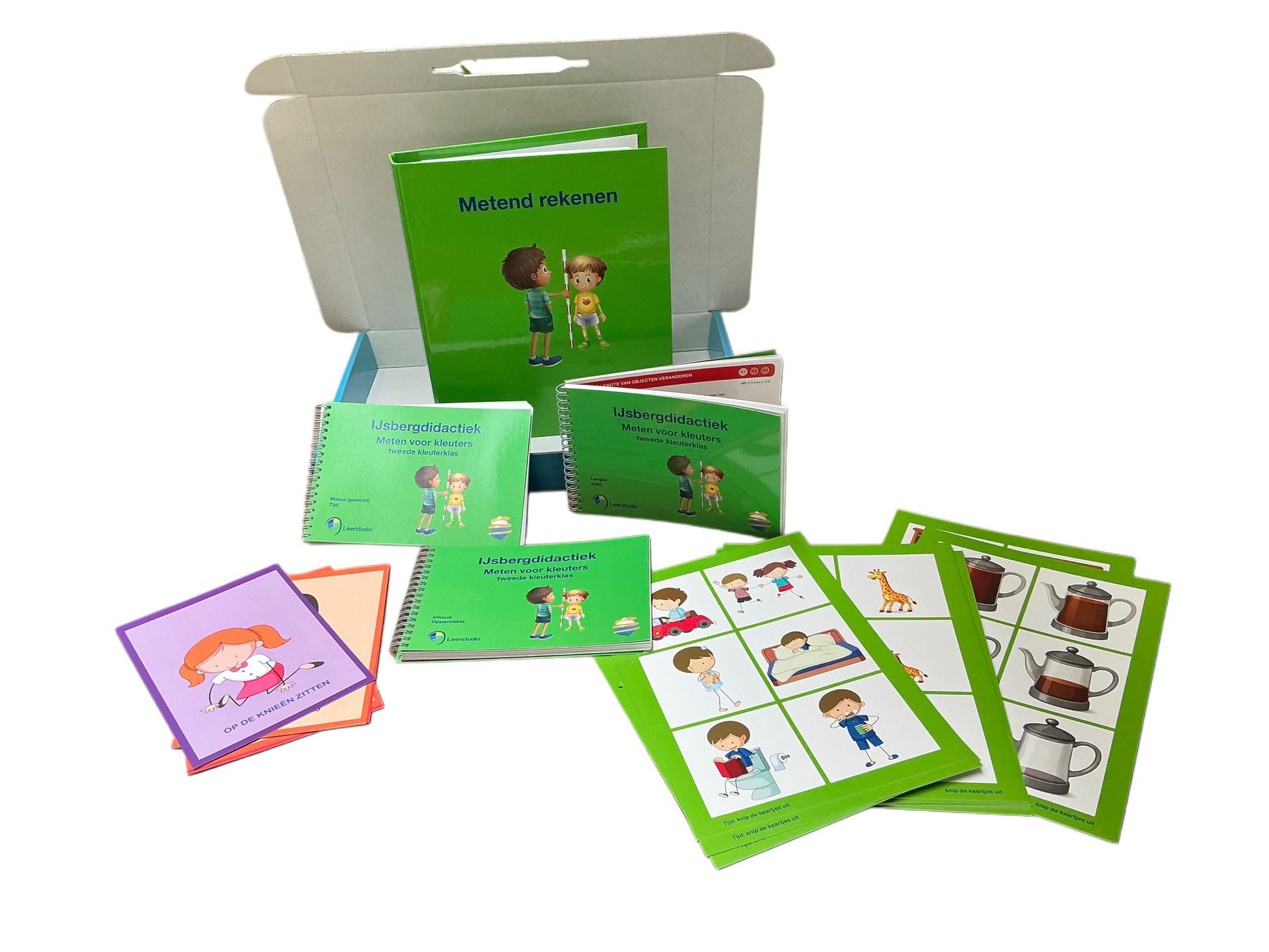 Een box met instructie- en doe-activiteiten over lengte, inhoud, gewicht, oppervlakte, tijd en geld.