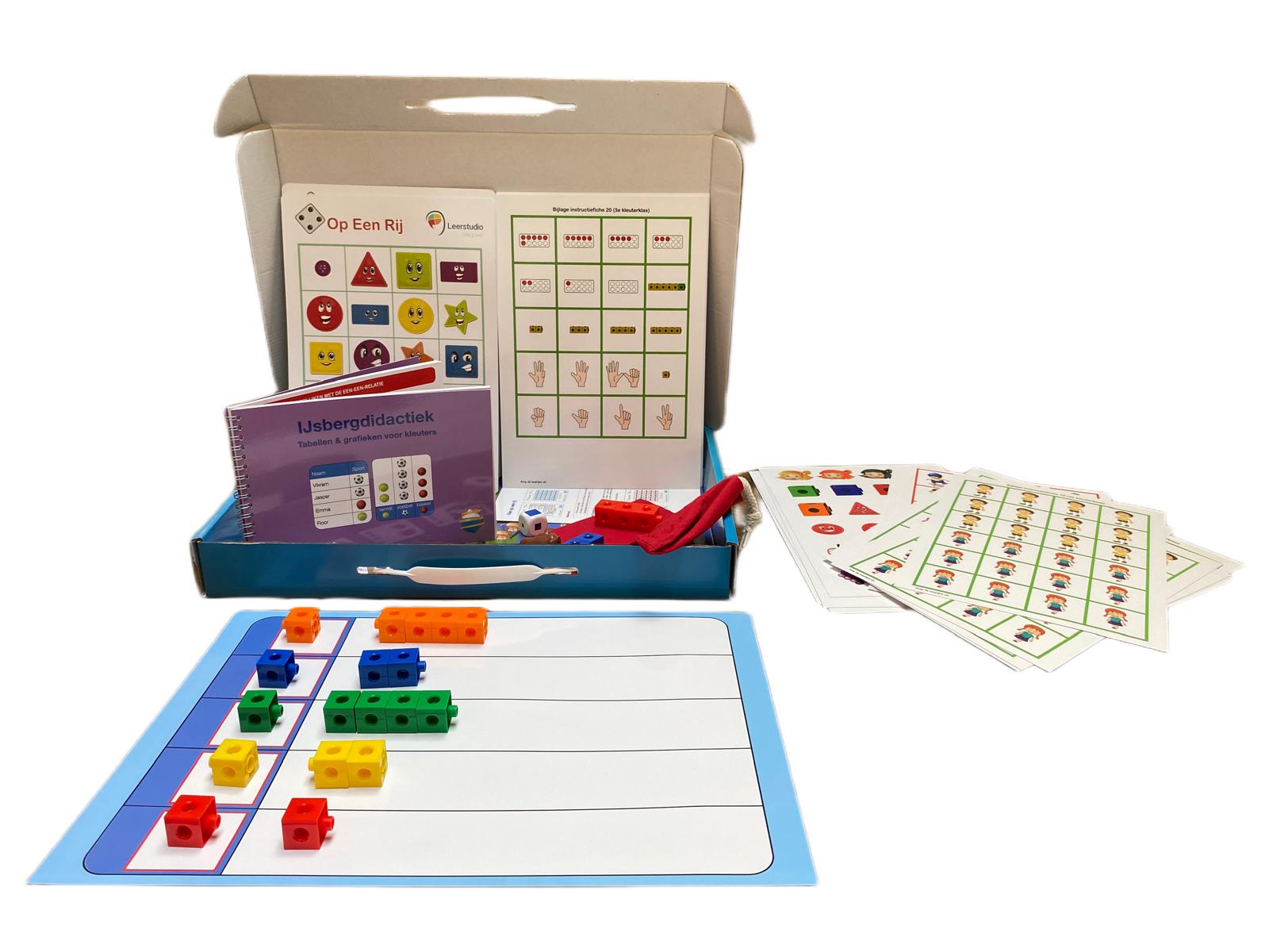 Een box met materiaal (instructieboekje met doe-activiteiten en bijhorend materiaal) om tabellen en grafieken bij kleuters aan te leren.