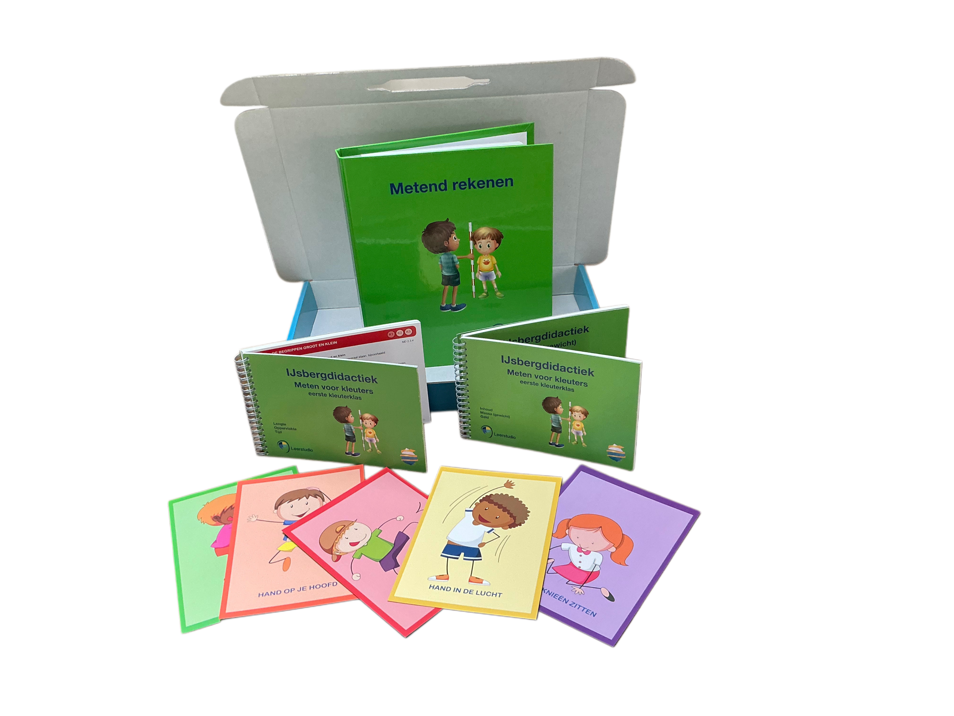 De box bevat materiaal om doelgericht met meten bezig te zijn in de eerste kleuterklas. Het materiaal bestaat uit twee instructieboekjes met doe-activiteiten rond lengte, inhoud, gewicht, oppervlakte, tijd en geld. Daarbij zit een map met aanvullende prenten en kopieerbladen.