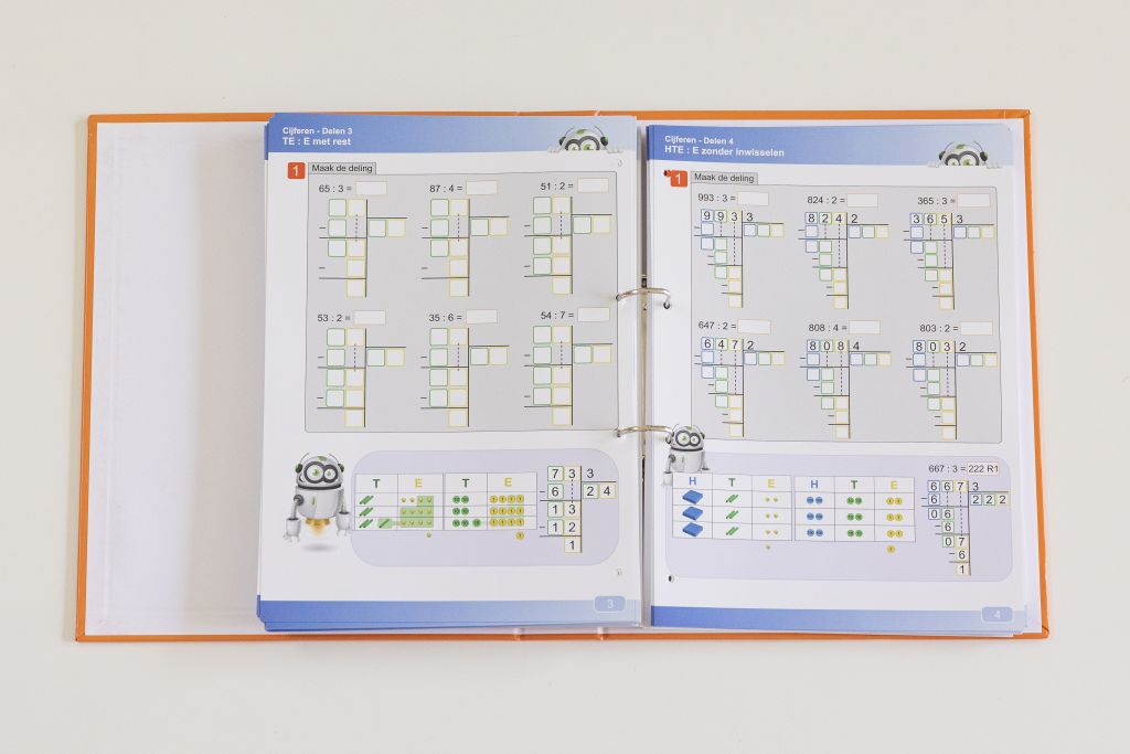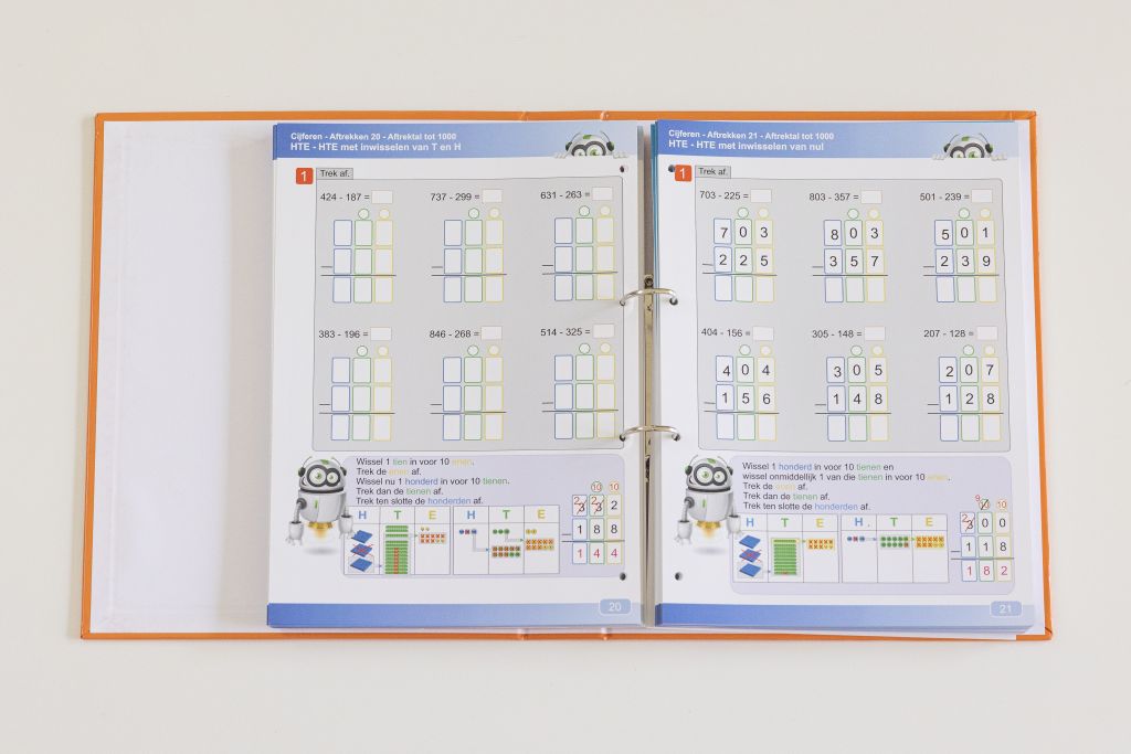 In de map cijferen (2e t/m 6e leerjaar) zitten alle instructiefiches om cijferen inzichtelijk aan te brengen voor de hele lagere school. Daarbij horen A3-placemats (10 per type) om te handelen en een jaar toegang voor de online oefengenerator (met mogelijkheid tot verlenging). Met de generator kan je zoveel oefenbladen genereren als je wil, op het niveau dat je zelf aanklikt.