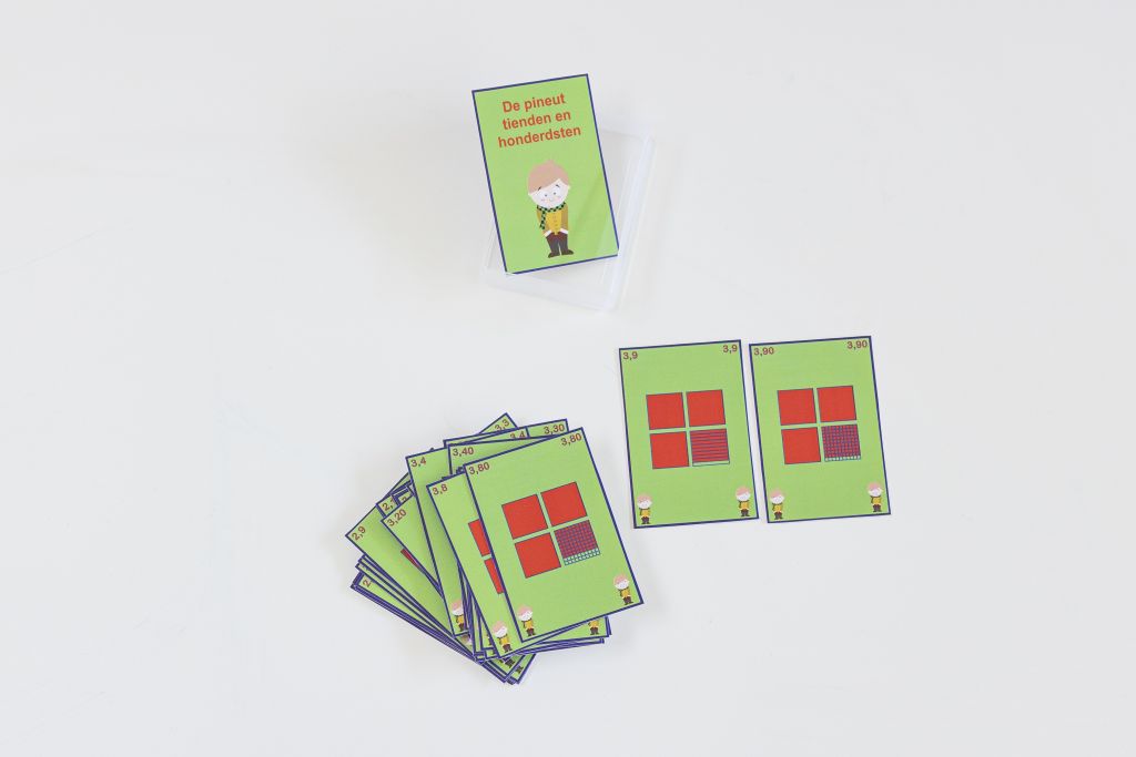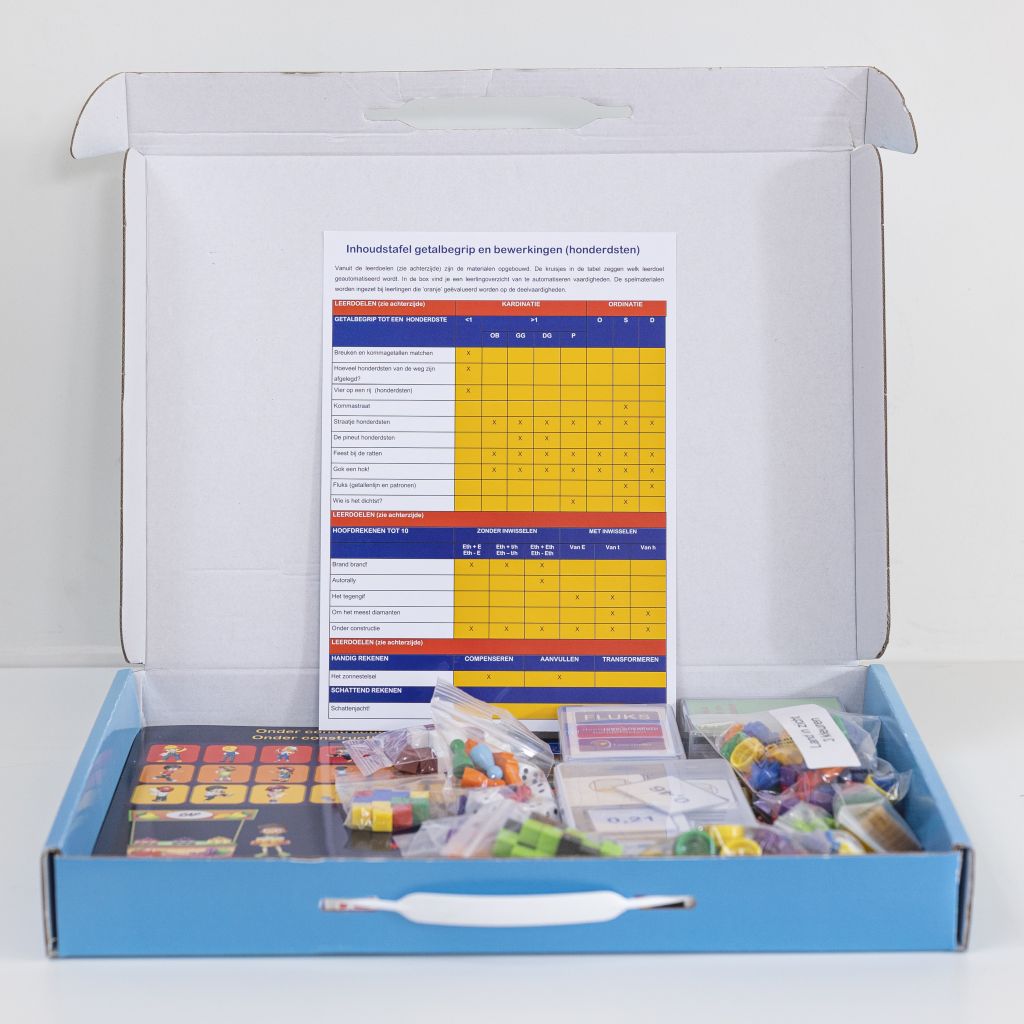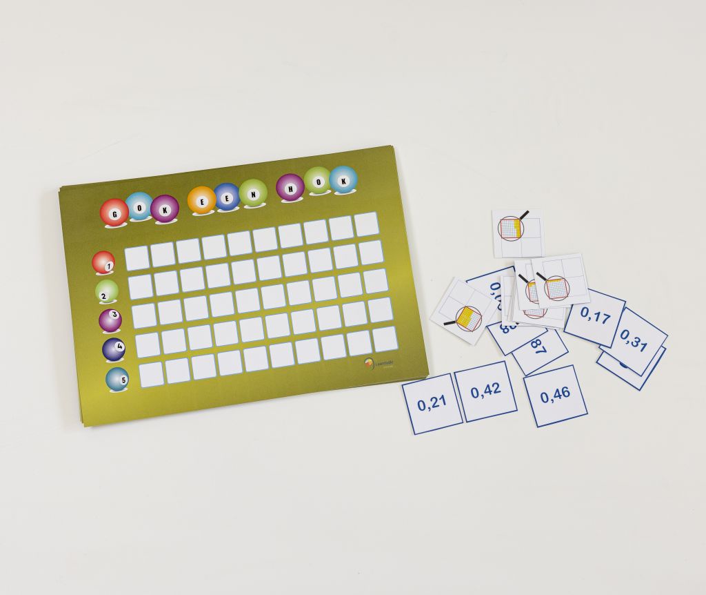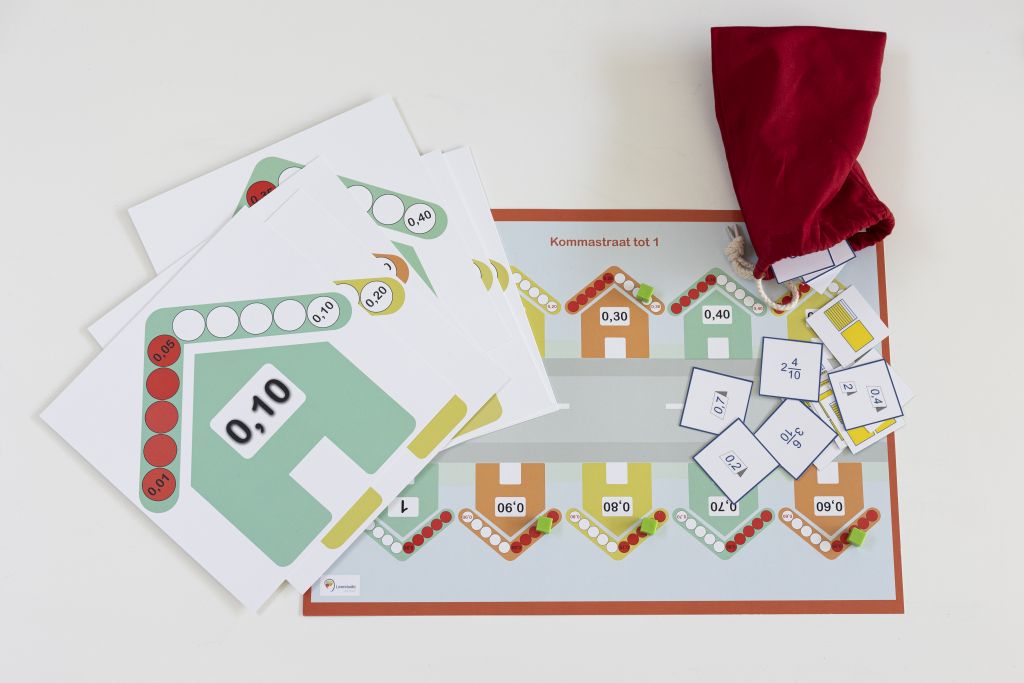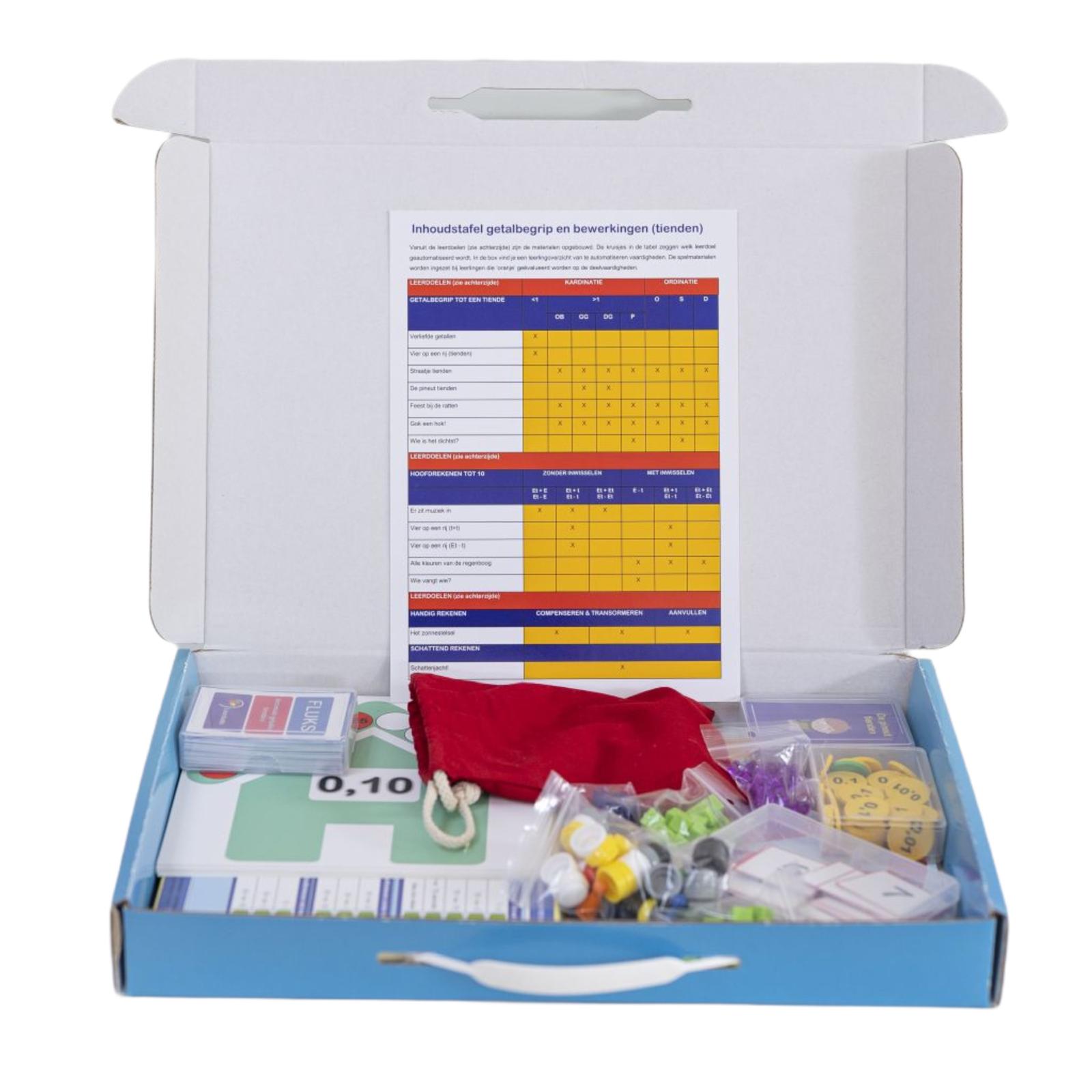 De box bevat 59 verschillende spelletjes (op 350gr, gefolieerd - met de nodige toebehoren) voor het hele domein (4e t/m 6e leerjaar) van de kommagetallen: