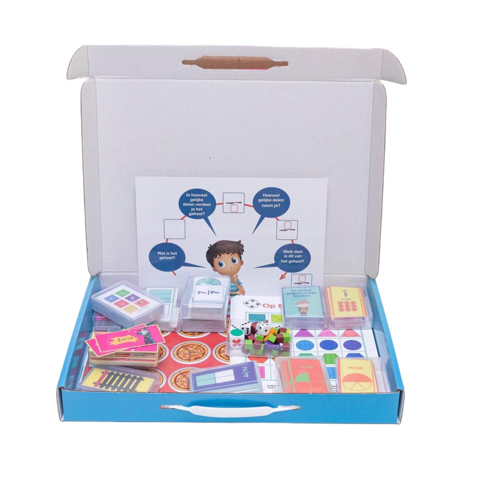 In de box vind je 44 verschillende rekenspelletjes om breuken op een aantrekkelijke wijze te oefenen en automatiseren. De spelmaterialen (op 350gr, gefolieerd - met toebehoren) oefenen op alle beukenleerstof van de lagere school (stambreuken, echte breuken, onechte breuken, gemengde getallen, gelijkwaardigheid, vereenvoudigen, breuken optellen en aftrekken, vermenigvuldigen en delen, breuk van een hoeveelheid, breuk als resultaat van een deling).
